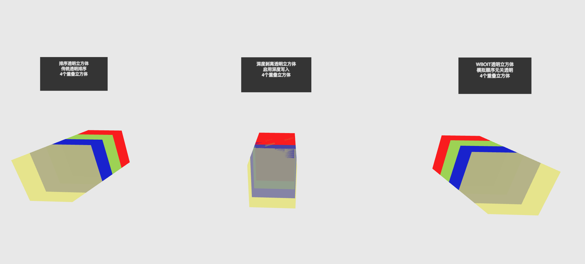 如上图中间的示例,可以看到如果立方体叠在一起,深度剥离方式在重叠区域出现闪烁,就是因为开启了深度写入,然后出现深度冲突现象:多个透明对象在相同深度位置。示例实现的关键代码如下: